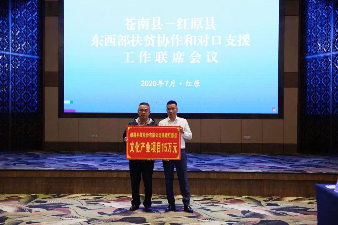會(huì)議上,舉行了結(jié)對(duì)幫扶協(xié)議簽訂和資金受授儀式,蒼南縣慈善總會(huì)、維融科技單位等對(duì)口支援與紅原縣文旅局。維融科技捐贈(zèng)紅原縣文化產(chǎn)業(yè)項(xiàng)目15萬(wàn)元,以助力紅原縣文化產(chǎn)業(yè)項(xiàng)目的開展和落實(shí)。