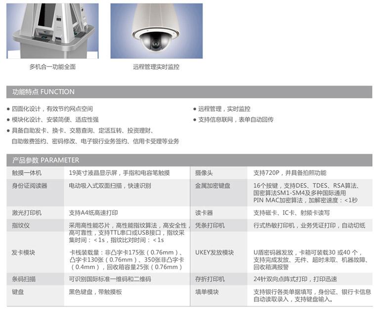 具備自助發(fā)卡、換卡、交易查詢、定活互轉(zhuǎn)、投資理財(cái)、 自助繳費(fèi)簽約、密碼修改、電子銀行業(yè)務(wù)簽約、信用卡受理等業(yè)務(wù)